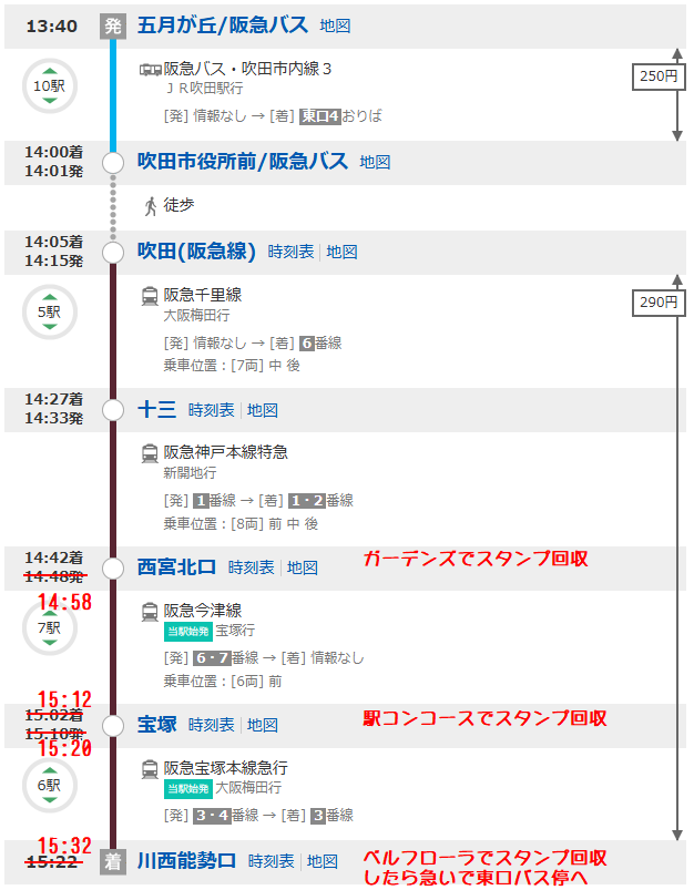 また上記『9.』の前に未回収のスタンプがある場合はこの時間で「日生中央→山下→川西能勢口→宝塚→西宮北口(ガーデンズ)→宝塚(or十三)→川西能勢口」といったアクロバットも不可能ではありません。